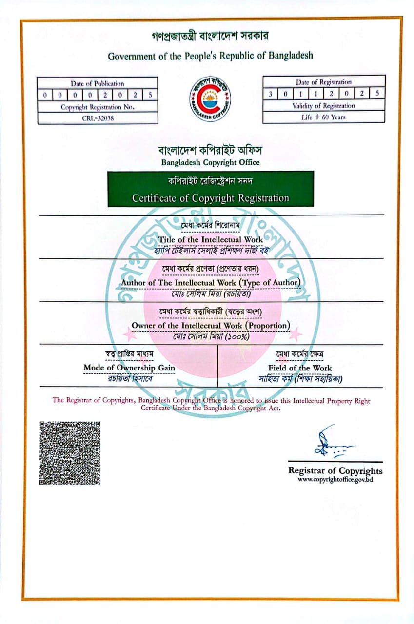 (১০০% অরিজিনাল) এটি গণপ্রজাতন্ত্রী বাংলাদেশ সরকারের কপিরাইট অফিস কর্তৃক নিবন্ধিত একটি হ্যাপি টেইলার্স সেলাই প্রশিক্ষণ দর্জি বই (রেজিস্ট্রেশন নম্বর: ( CRL-32038)
